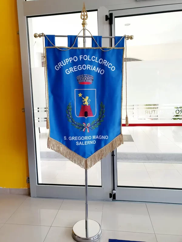 Gonfalone o Labaro o Stendardo stampato in digitale su poliestere setificato, confezionato con fodera e rifinito con frangia oro o argento.
